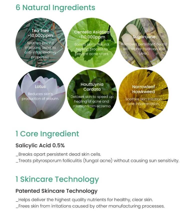 - Centella Asiatica (250,000ppm): Boosts skin’s natural healing process to prevent acne scars