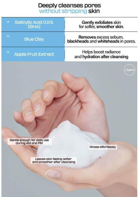 - A mild acidic (pH 5.5–6.5) purifying cleanser enriched with Salicylic Acid and Apple Fruit Extract, working harmoniously to gently exfoliate the skin, revealing a smoother complexion while providing essential hydration for a radiant glow.